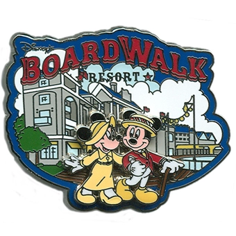 This open edition pin features the logo for Disney’s Boardwalk Resort and includes Mickey Mouse and Minnie Mouse.