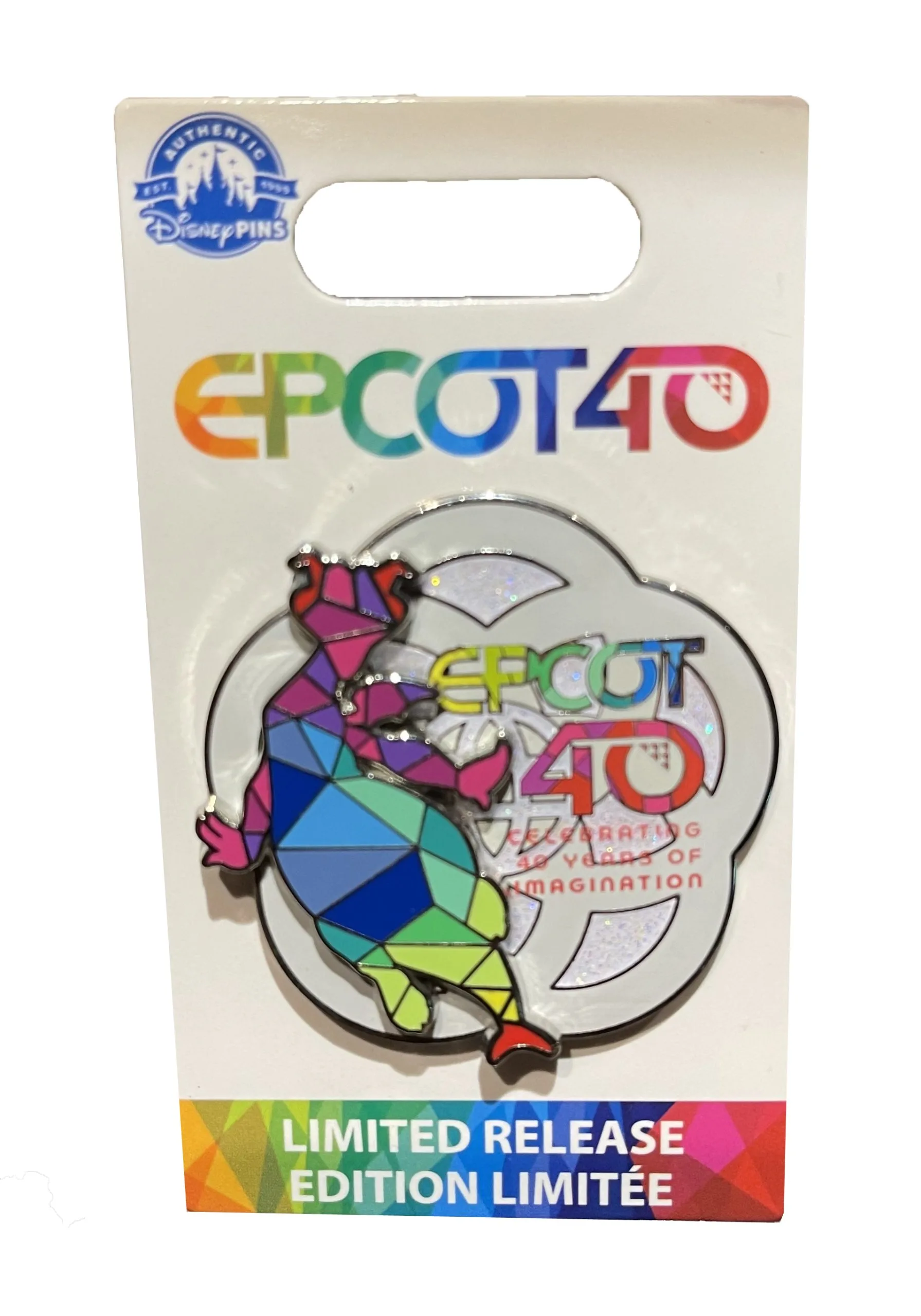 Celebrate 40 years of imagination with this limited release EPCOT anniversary pin-on-pin design featuring Figment with Spaceship Earth panels.
