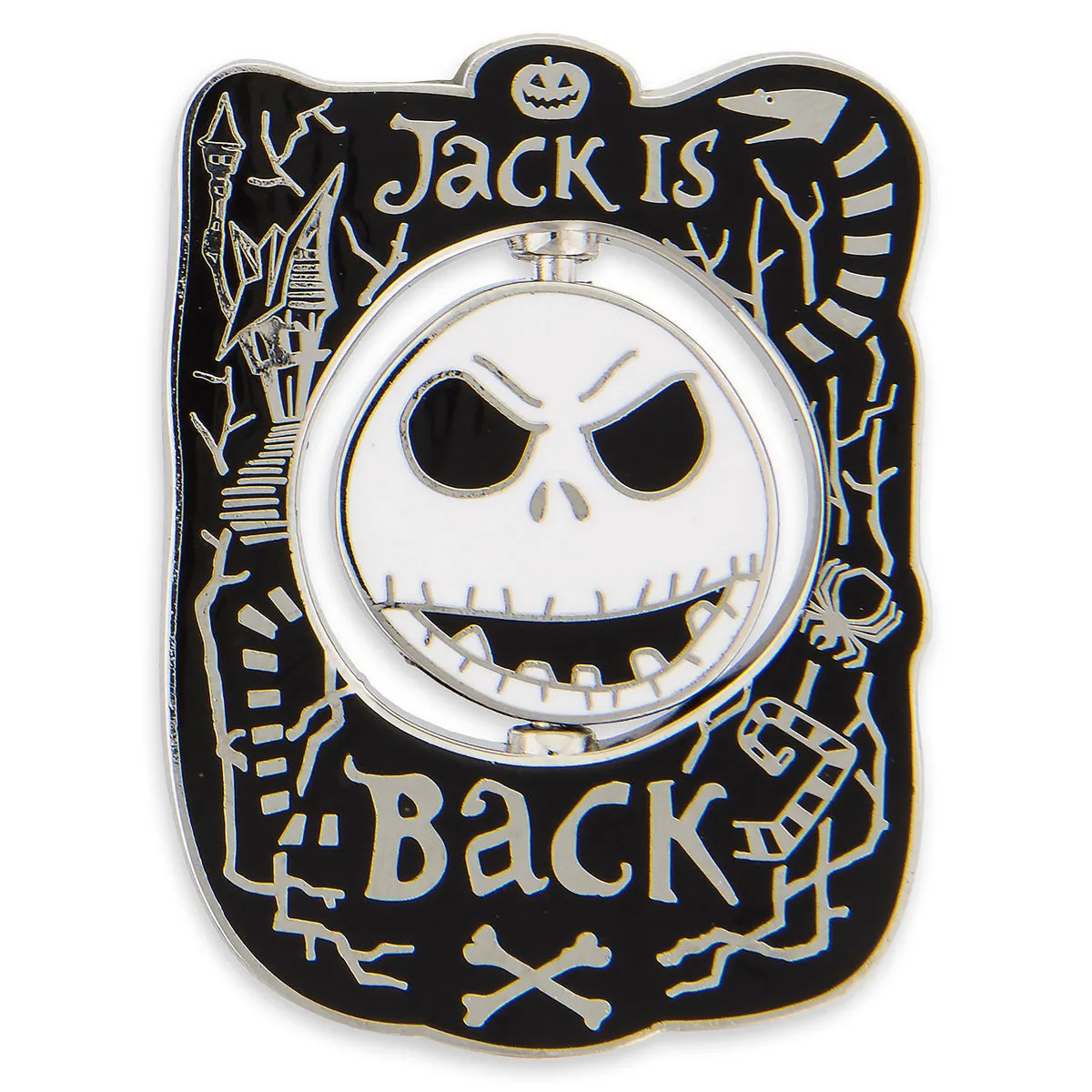 Jack Skellington’s two-faced nature is reflected in this spinner pin inspired by Tim Burton’s The Nightmare Before Christmas. His distinctive face revolves with different expressions in the middle of this pin that declares ”Jack is Back.”