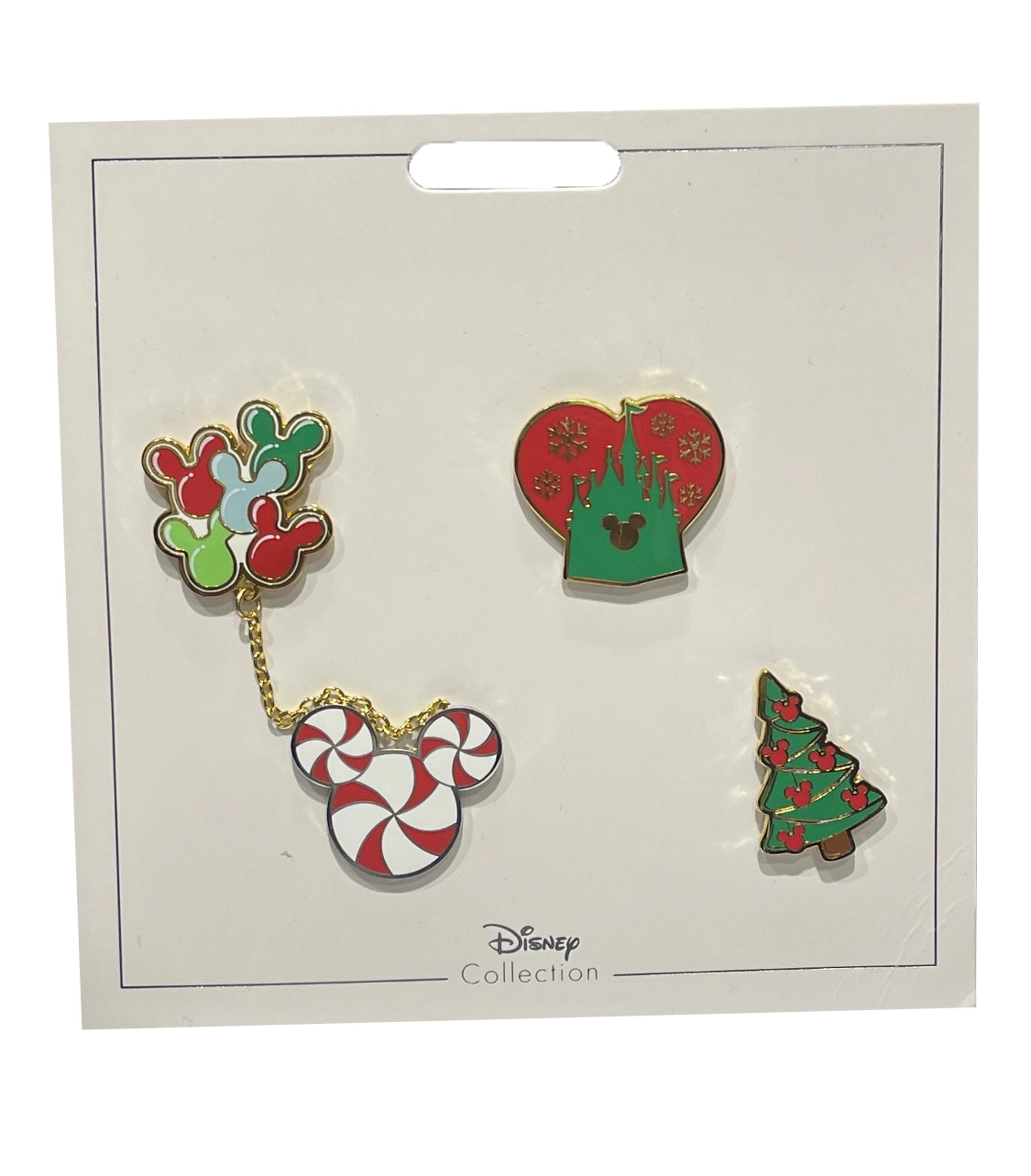 Bring in the 2021 Holiday Celebration with this set of 4 Pins. Features 4 Festive Pins with Mickey Balloons, Castle, Mickey Peppermint Icon, and a Tree.