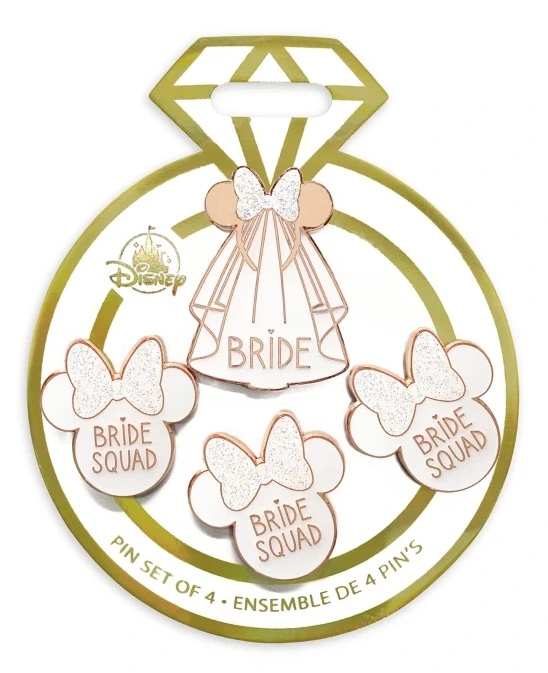 Here comes the Bride–and her squad of besties–proudly displaying this set of four cloisonné pins featuring our Minnie Mouse icon. A diamond ring-shaped backer card will forever hold the pieces.